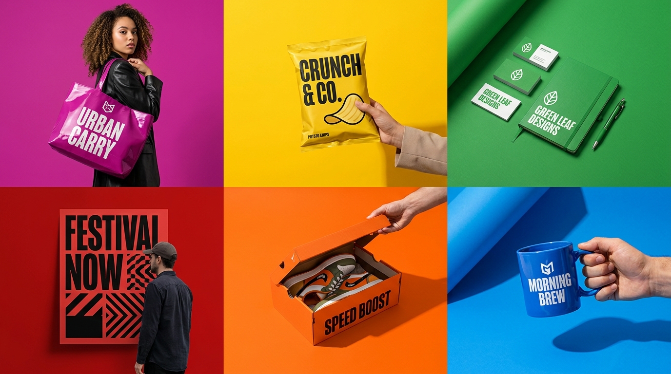Photoreal product mockups from a single reference — apparel, packaging, print, and more.